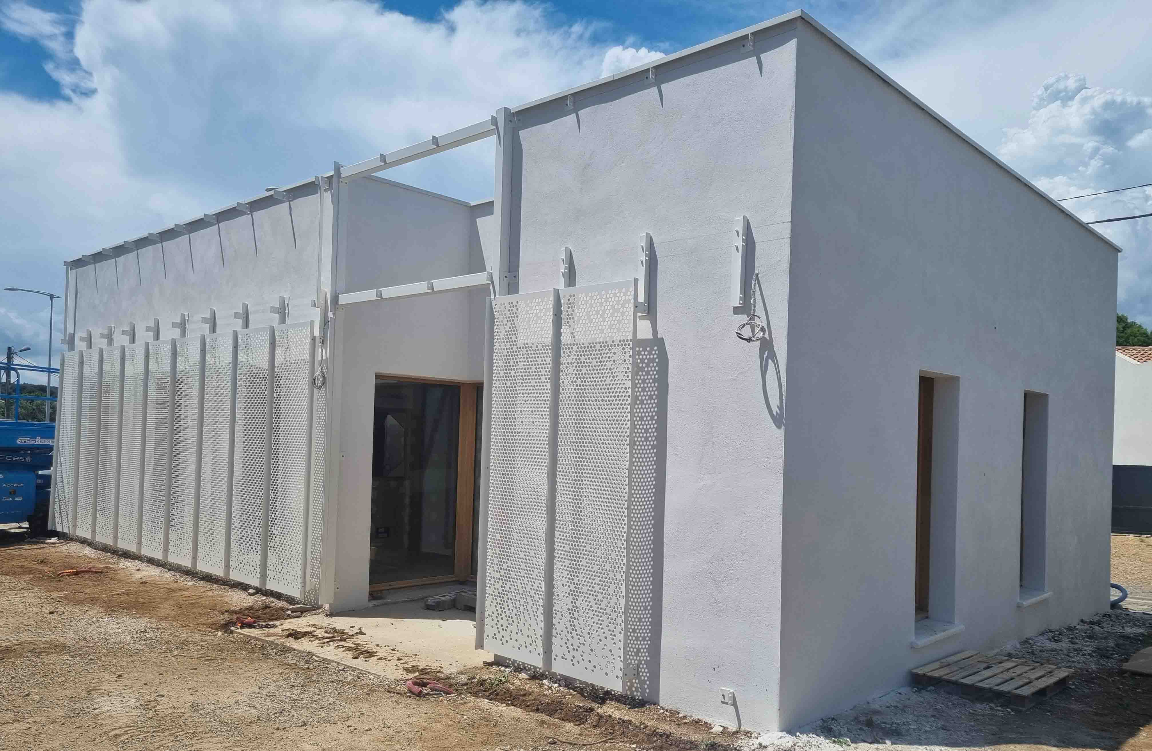 • Habillage façades double peau : réalisation d'un habillage de façade en plaque d'acier découpée et pliée selon dessin architecte,• Porte d'entrée en plaque d'acier découpée et pliée selon dessin architecte,