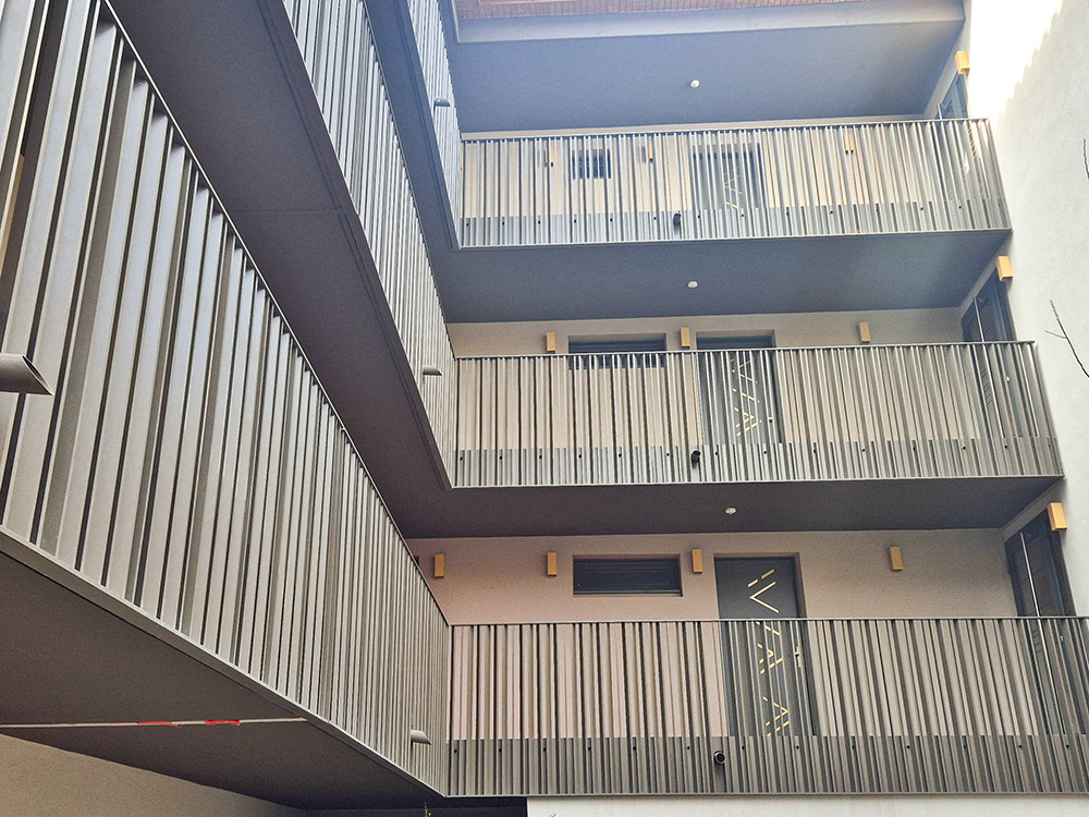 Et plusieurs ouvrages complémentaires, tels que des boîtes aux lettres extérieures, râteliers pour local vélos, poutres métalliques et faux plafonds en résilles métalliques.