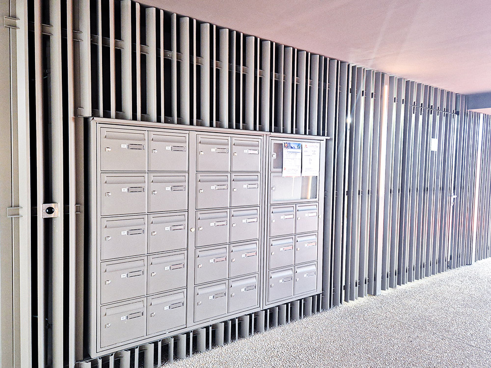 Et plusieurs ouvrages complémentaires, tels que des boîtes aux lettres extérieures, râteliers pour local vélos, poutres métalliques et faux plafonds en résilles métalliques.